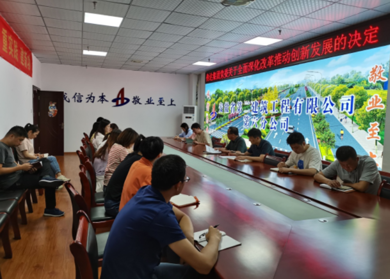 第六公司黨支部傳達學習安徽建工集團全面深化改革推動創(chuàng)新發(fā)展動員部署暨主題教育黨課報告會精神。會議要求,一要提高政治站位,統(tǒng)一思想認識,充分認識到集團深化改革推動創(chuàng)新發(fā)展是一項意義重大、影響深遠的綜合性改革,是集團在新起點上,把握新形勢新要求,謀劃新思路新發(fā)展的舉措,要全面貫徹落實建工控股黨委的決策部署,認真把握集團全面深化改革推動創(chuàng)新發(fā)展的歷史使命;二要緊緊圍繞集團戰(zhàn)略部署和工作安排,進一步樹立為集團大發(fā)展、轉(zhuǎn)型發(fā)展、高質(zhì)量發(fā)展作貢獻的責任和擔當意識;三要認真落實集團工作安排,進一步做好市場開拓,搶抓市場先機,持續(xù)推進項目標準化建設,嚴格落實集團、公司各項規(guī)定,樹牢風險意識,做到“五個嚴”,持續(xù)推動公司改革轉(zhuǎn)型、高質(zhì)量發(fā)展。
