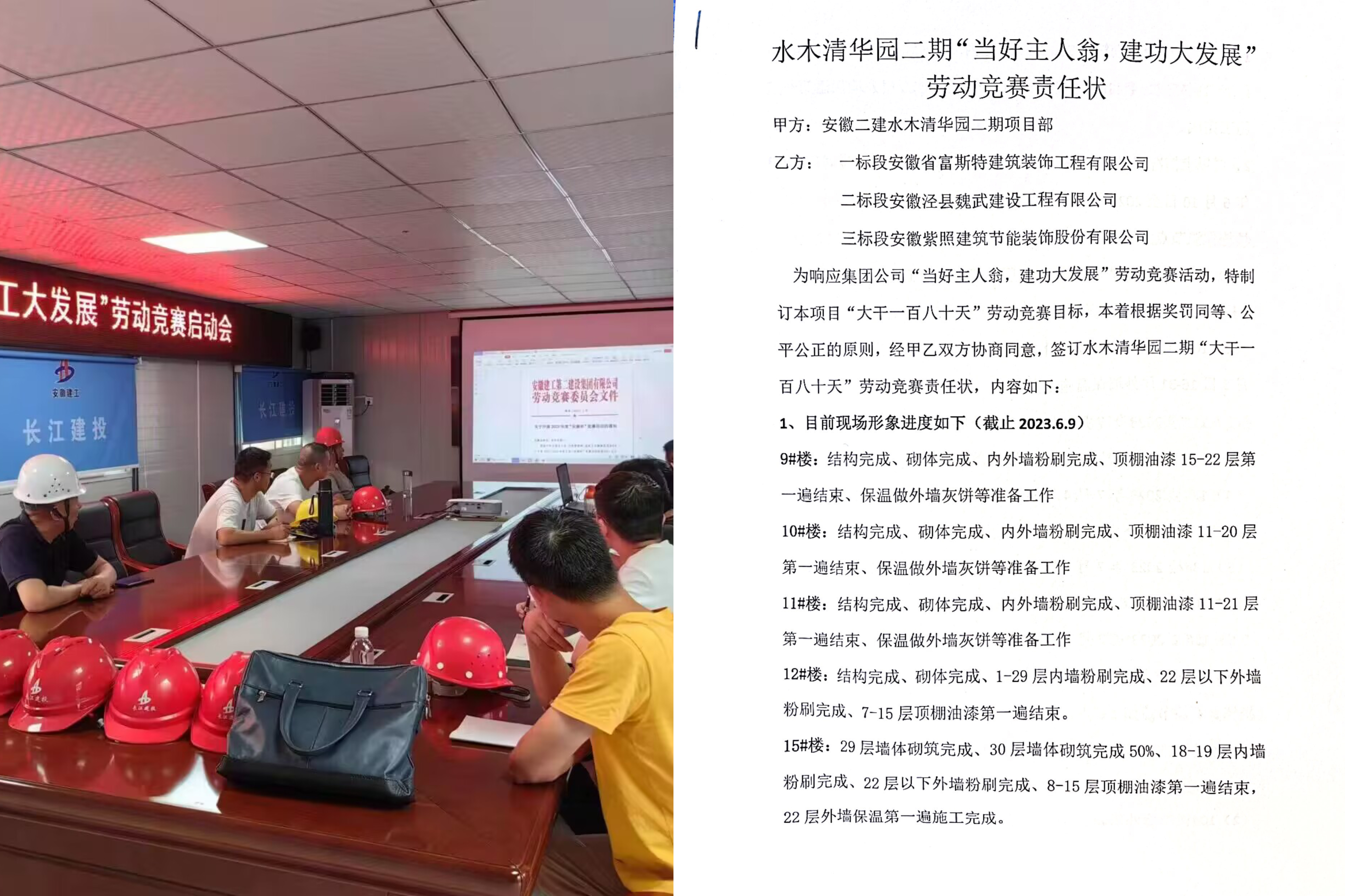為積極響應(yīng)公司“當好主人翁 建功大發(fā)展”勞動競賽號召,銅陵水木清華園二期項目部以“項目基礎(chǔ)管理年”活動為抓手,聚焦全年生產(chǎn)目標任務(wù);以勞動精神為引領(lǐng),下好先手棋,打好主動仗;以提質(zhì)增效、價值創(chuàng)造為重點,不斷提升全員勞動生產(chǎn)率,形成比學趕超的濃厚氛圍,為完成勞動競賽目標任務(wù)奠定堅實基礎(chǔ)。