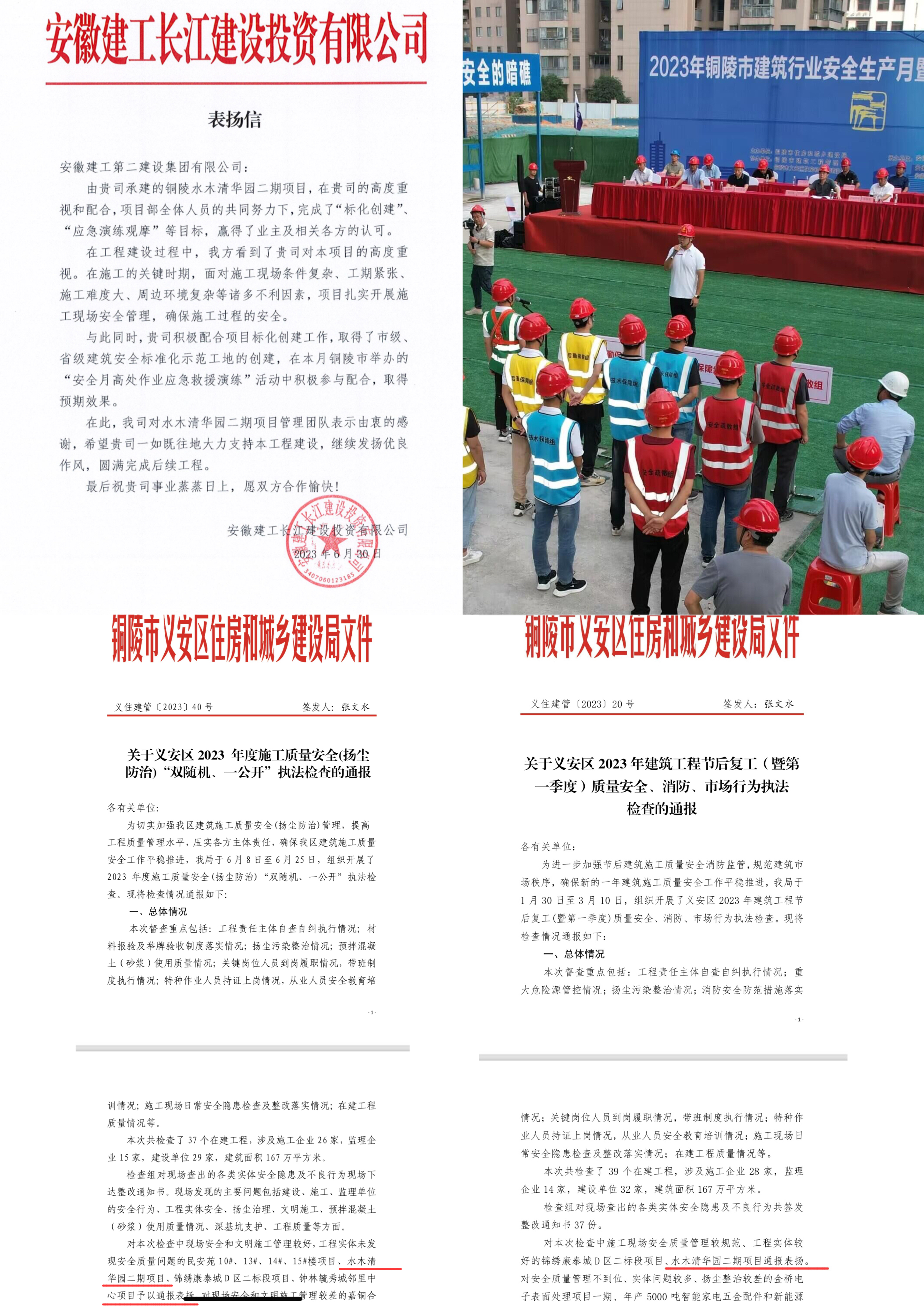 項目自開工以來先后創(chuàng)建了安徽省及銅陵市“建筑安全生產(chǎn)標準化示范工地”、集團和公司兩級“黨員先鋒號”“工人先鋒號”“青年文明號”工程。項目部在義安區(qū)住建局2023年一季度、二季度檢查中被連續(xù)通報表揚,并順利承辦了2023年銅陵市建筑行業(yè)安全生產(chǎn)月暨高處作業(yè)應(yīng)急救援演練活動,受到屬地主管部門的一致好評。