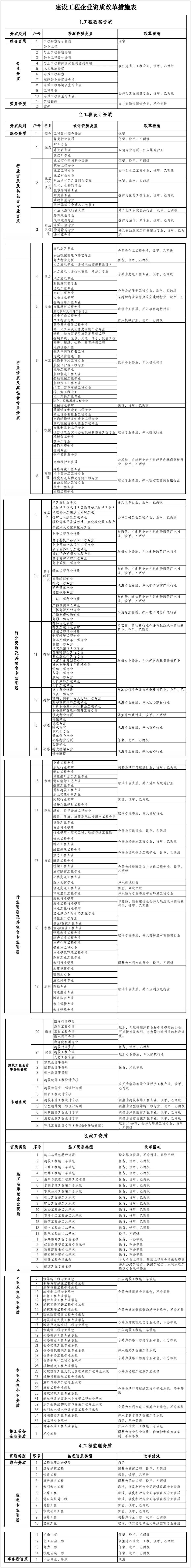 為保持資質(zhì)管理政策的穩(wěn)定性和連續(xù)性,避免對企業(yè)正常生產(chǎn)經(jīng)營造成干擾,保障工程質(zhì)量安全,在維持工程勘察、工程設(shè)計、施工、工程監(jiān)理等資質(zhì)標(biāo)準(zhǔn)框架基本不變的同時,按照“能減則減、能并則并”的原則,大幅壓減企業(yè)資質(zhì)類別和等級。(詳見下文建設(shè)工程企業(yè)資質(zhì)改革措施表)對可由市場自主選擇、行業(yè)自律進(jìn)行調(diào)節(jié)的企業(yè)資質(zhì)類別予以取消。對部分專業(yè)劃分過細(xì)、業(yè)務(wù)范圍相近、市場需求較小的企業(yè)資質(zhì)類別予以合并。對部分設(shè)置過多的資質(zhì)等級進(jìn)行歸并,減少資質(zhì)層級。