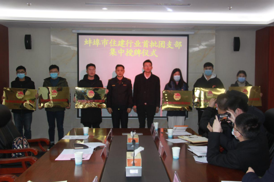2021年2月2日上午,蚌埠市住房城鄉(xiāng)建設行業(yè)首批團支部集中授牌儀式在蚌埠市住建局舉行。會議由蚌埠市住建局副縣級領導王明芳主持。蚌埠市住建局黨委書記、局長王家渠,黨委委員、副局長汪文學;蚌埠市團市委黨組副書記韓見,組織部部長、少年部部長雷蕾;蚌埠市建筑管理處黨委書記、主任唐士全,團委書記韓道斌;蚌埠市住建系統(tǒng)團工委書記鄒振飛同志出席授牌儀式。安徽二建公司蚌埠溪湖湖山春曉、山香安置房項目參加市住建行業(yè)首批團支部集中授牌。