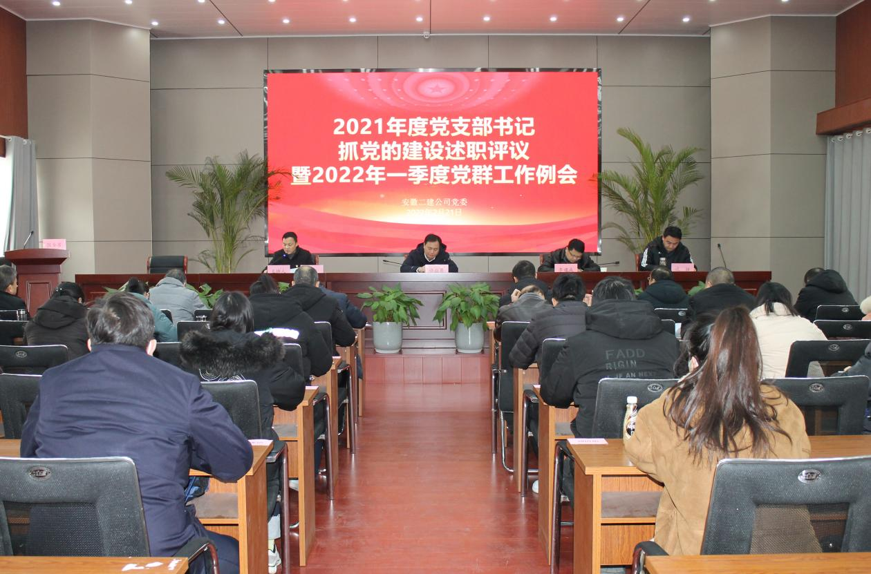 2月21日下午,安徽二建公司在新會議室召開2021年度基層黨支部書記抓黨的建設述職評議暨2022年一季度黨群工作例會。公司黨委書記、董事長許業(yè)勇,黨委副書記、總經理李建成,黨委副書記、工會主席王軍,黨委委員、紀委書記沈壯出席會議,公司黨群部門人員、所屬各單位黨支部書記、團支部書記、綜合辦負責黨務工作人員參會。會議由王軍主持。
