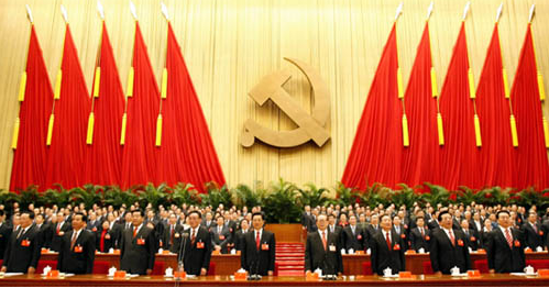 雄偉的人民大會堂大禮堂,氣氛隆重?zé)崃?。主席臺上方懸掛著“中國共產(chǎn)黨第十七次全國代表大會”的會標(biāo),后幕正中是鐮刀和錘頭組成的黨徽,10面鮮艷的紅旗分列兩側(cè)。二樓和三樓的眺臺上分別懸掛著“高舉中國特色社會主義偉大旗幟,以鄧小平理論和‘三個(gè)代表’重要思想為指導(dǎo),深入貫徹落實(shí)科學(xué)發(fā)展觀,為奪取全面建設(shè)小康社會新勝利而奮斗!”“偉大、光榮、正確的中國共產(chǎn)黨萬歲!”的橫幅。